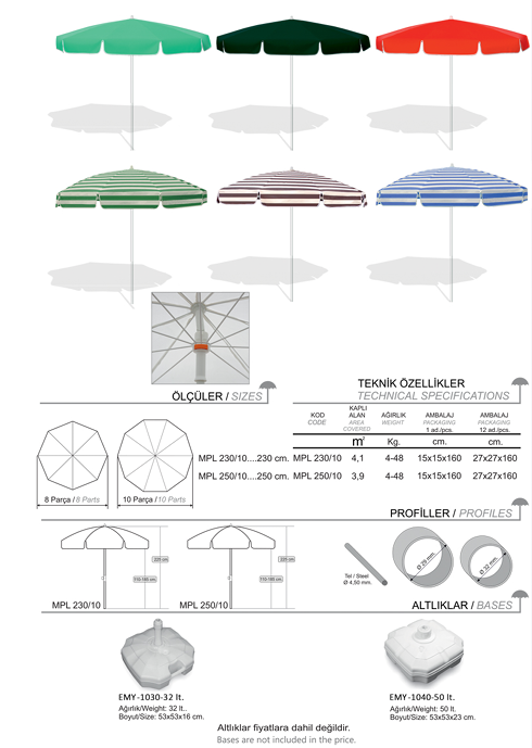 Generous Dimensions: Ø230 cm canopy with a 10-string frame and Ø250 cm coverage—perfect for spacious outdoor settings.