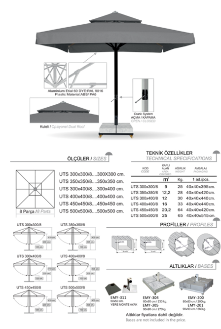 Enhance your outdoor ambiance with our 8-arm square umbrella, engineered for commercial settings such as cafés and restaurants. Combining robust materials with user-friendly design, this umbrella offers both durability and elegance.